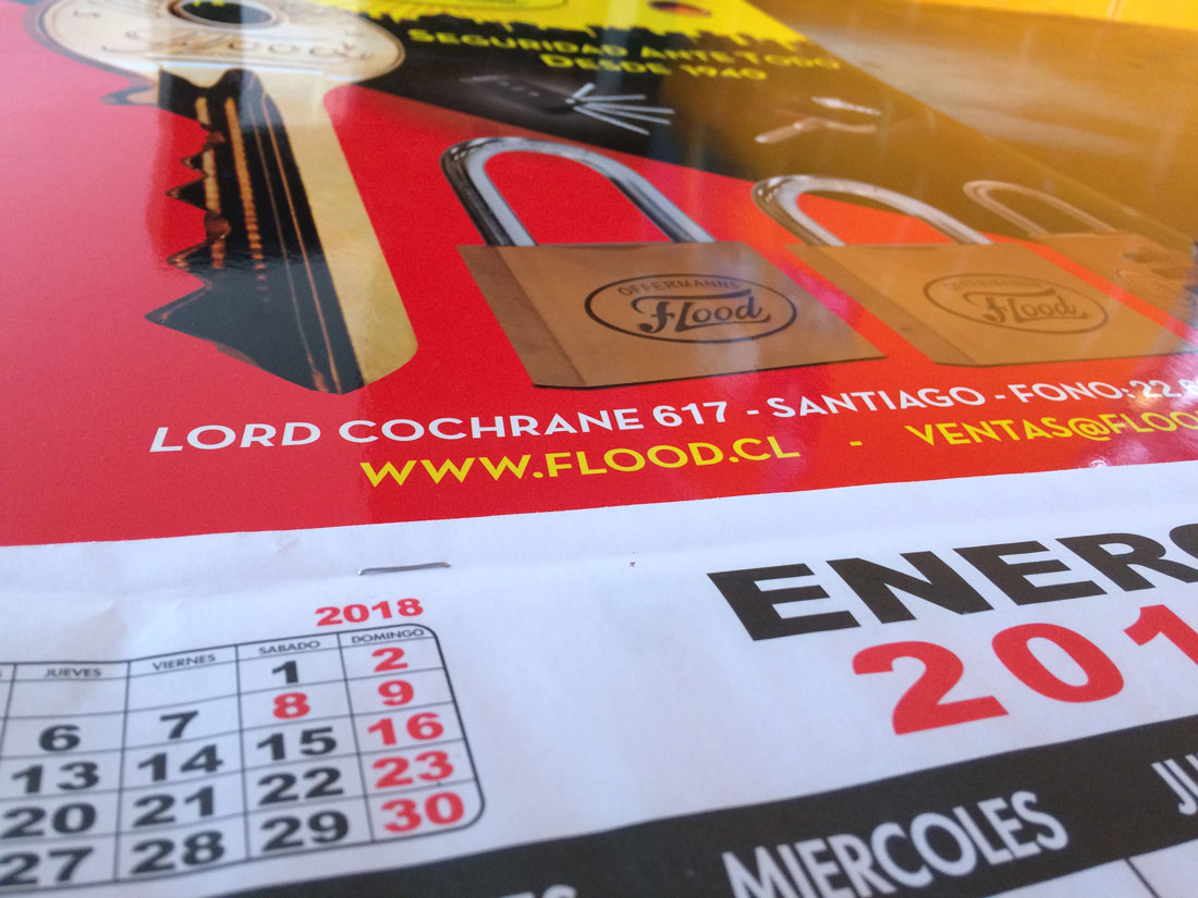 Diseño gráfico de calendario para cliente Flood. Con gran volumen de producción sobre 5.000 ejemplares para locales de cerrajería afiliados en todo chile.